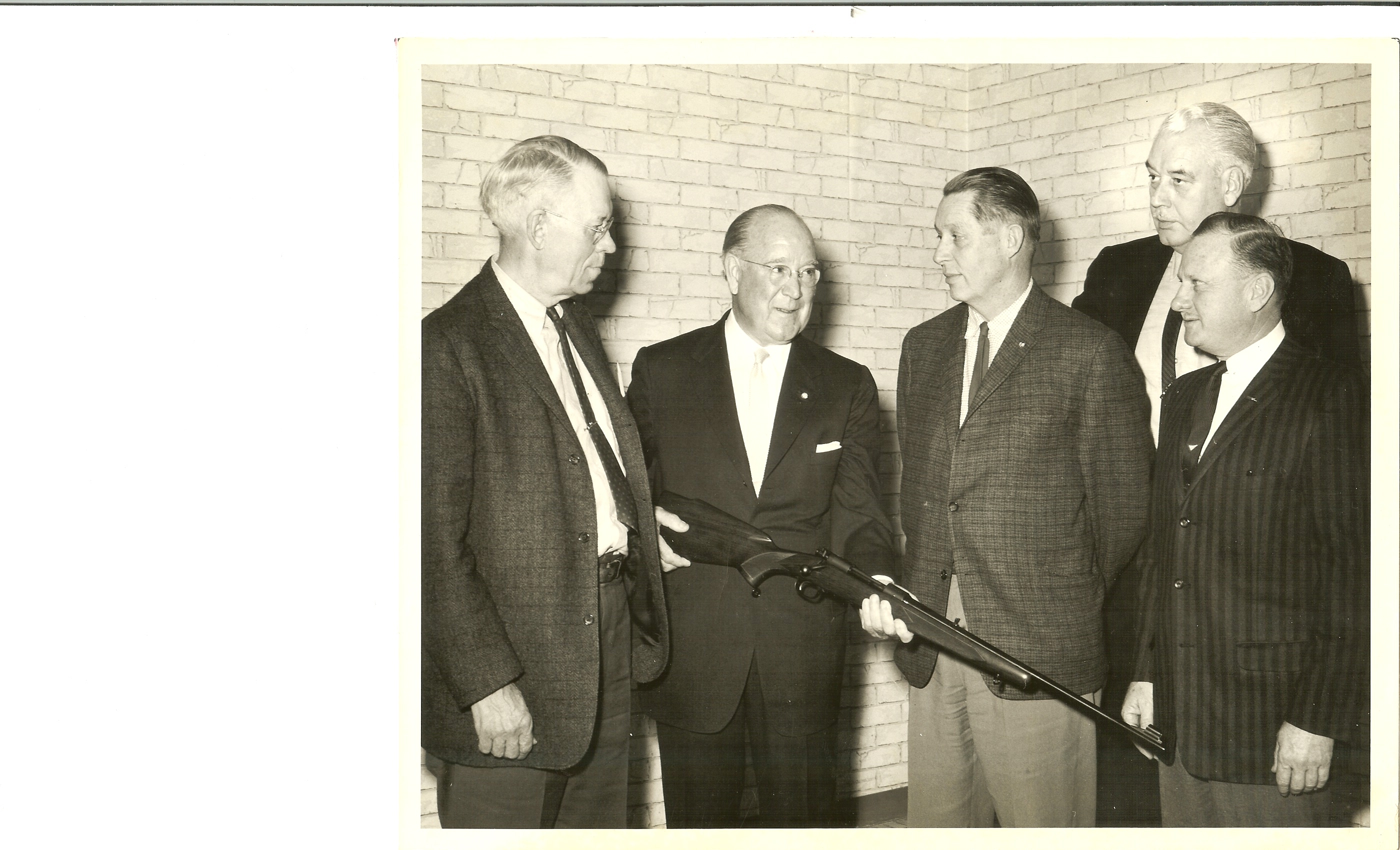 This is Jack O’Connor (Outdoor Life), John Olin, Warren Page (Field&Stream), Pete Kuhlhoff (Argosy) and Pete Brown (Sports Afield). This photo must date to the early ’60′s, as John Olin appears to be holding a Pre-64 Winchester Model 70 Featherweight. Wish I had a photo of Bill Ruger showing a Ruger No.1 to this same group!